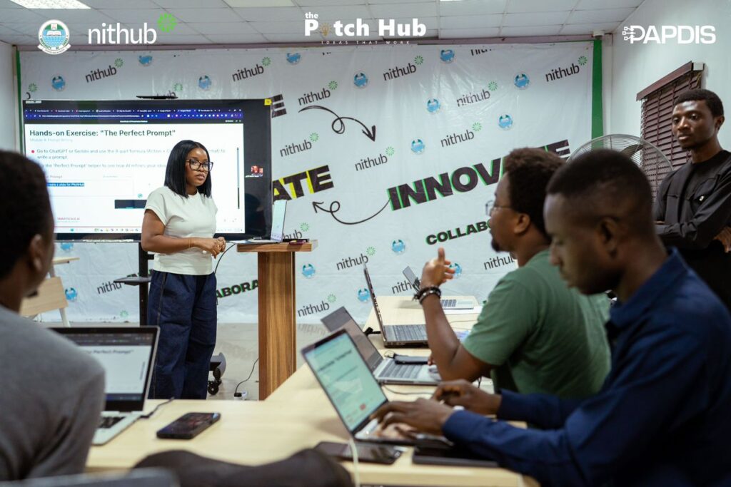 The programme was designed and led by Aurelia Abena Attipoe, Founder of The Pitch Hub, and facilitated by a team of experienced ecosystem practitioners, including Daniel Twum of Techbridge University College, Ghana, and Josiah Adesola, AI Ecosystem Lead at NitHub, University of Lagos. The programme was delivered through in-person implementation labs hosted in Accra and Lagos, reinforcing a hands-on approach that emphasised execution over theory.